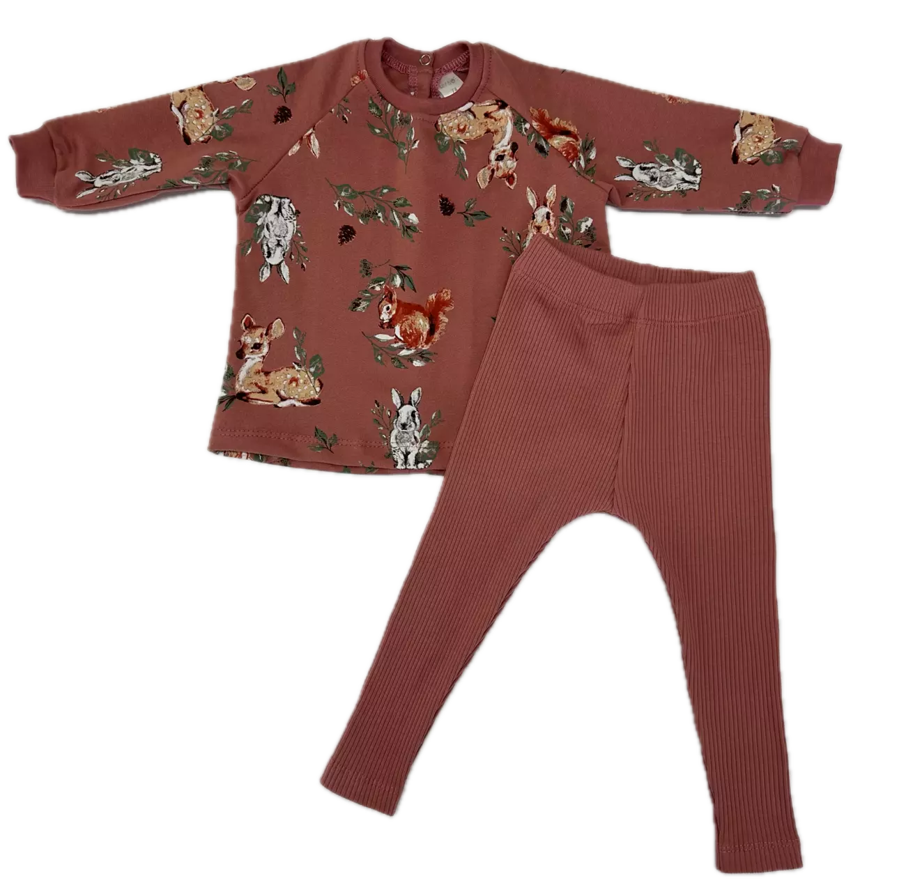 Комплект для дівчинки: кофтинка з манжетами на рукавах, застібка на кнопці на спині та лосини. Полотно кофтинки - двонитка з начосом, полотно лосин - рубчик з легким начосом. Бавовна 100%